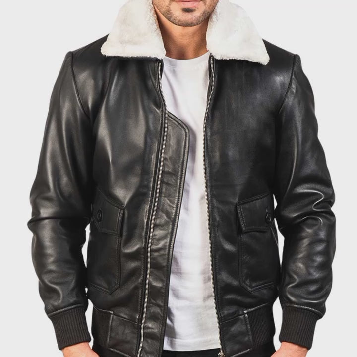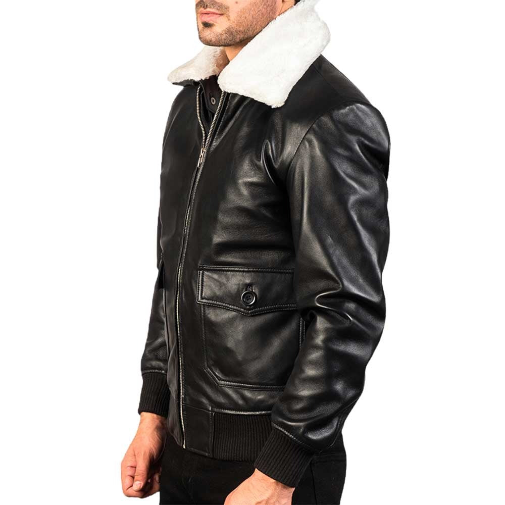 Men’s Flight Bomber Black Leather Jacket with White Collar